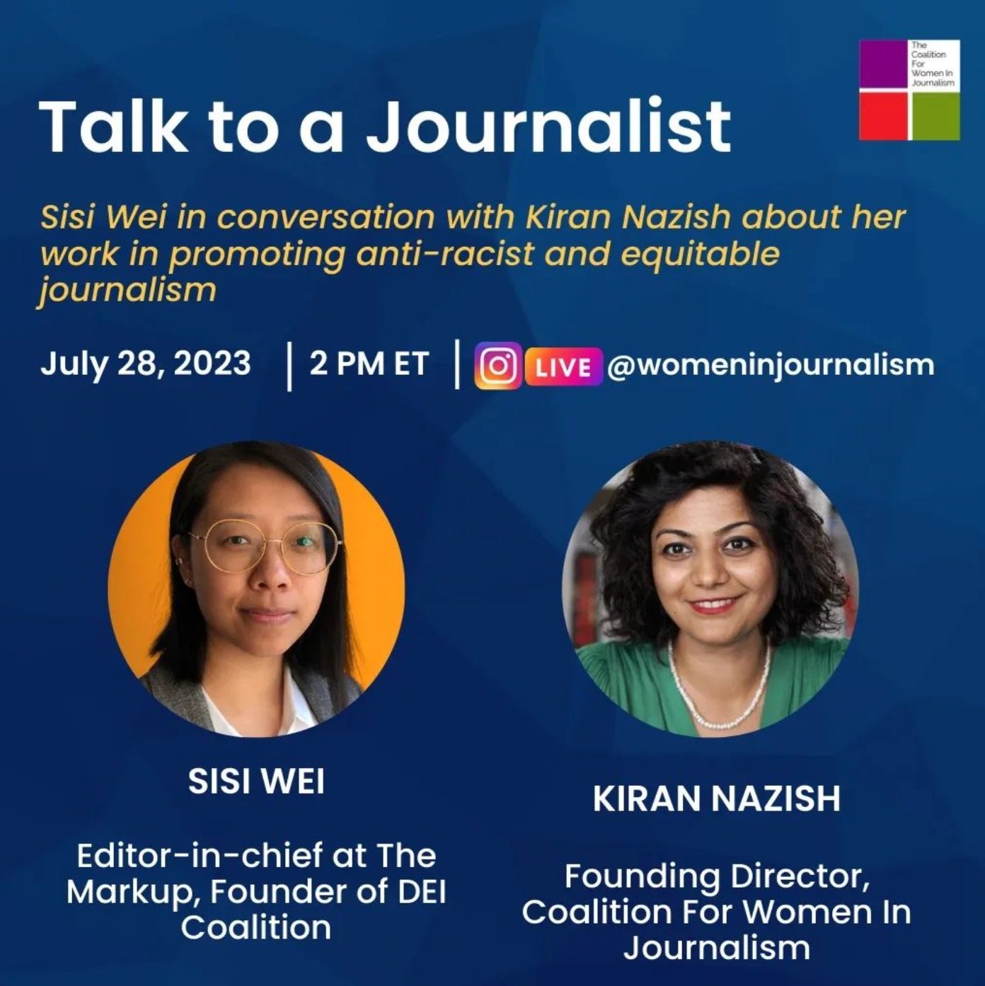 Talk to a Journalist: Sisi Wei about her work in promoting anti-racist and equitable journalism Events Jul 28 Written By 🗓️ July 28, 2023 🕐 2PM ET📍Instagram Live EventJuly2023July 2023