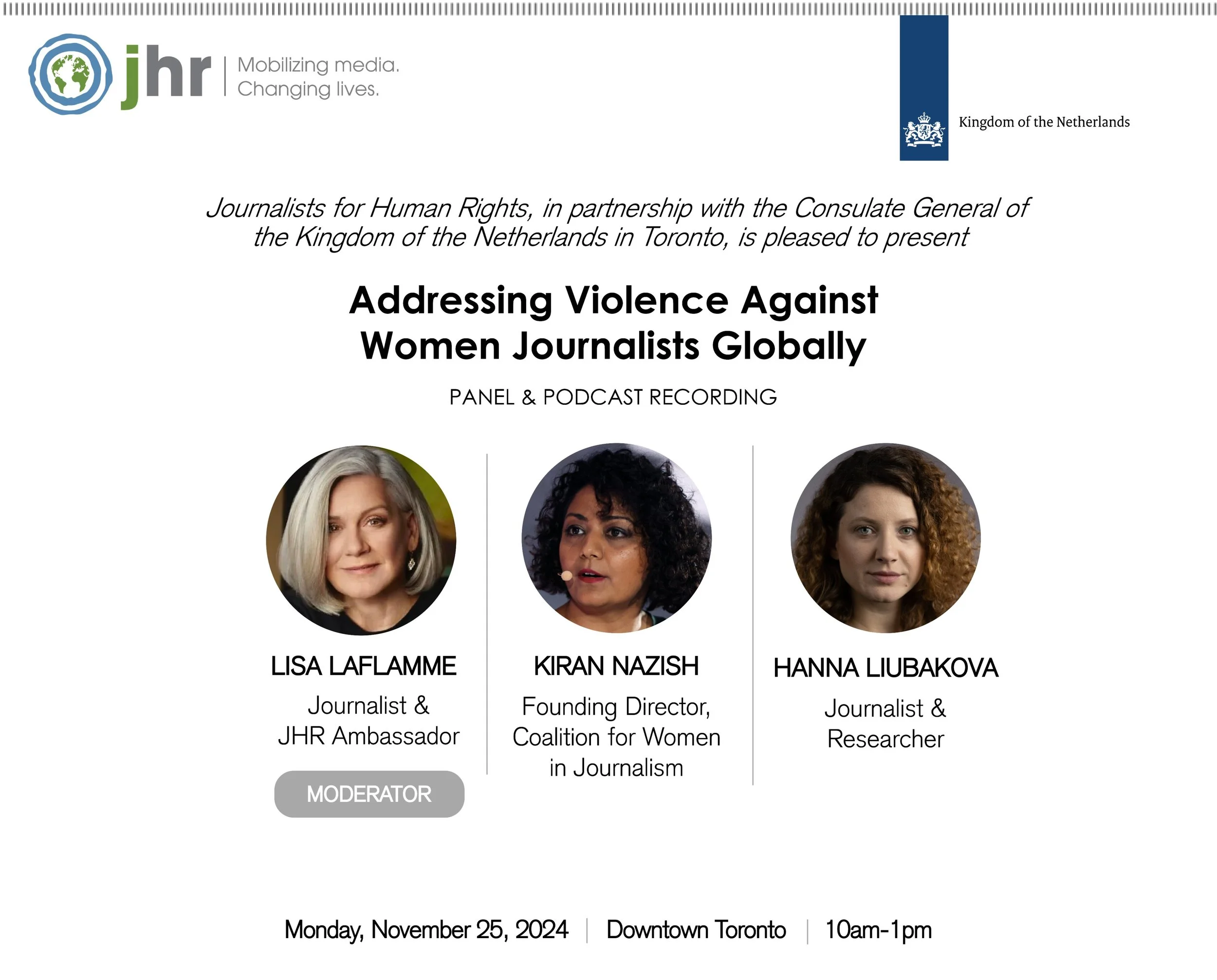 On Monday, November 25, Women Press Freedom is proud to join Journalists for Human Rights and the Embassy of the Netherlands to Canada for a powerful live podcast recording in Toronto, addressing violence against women journalists globally.