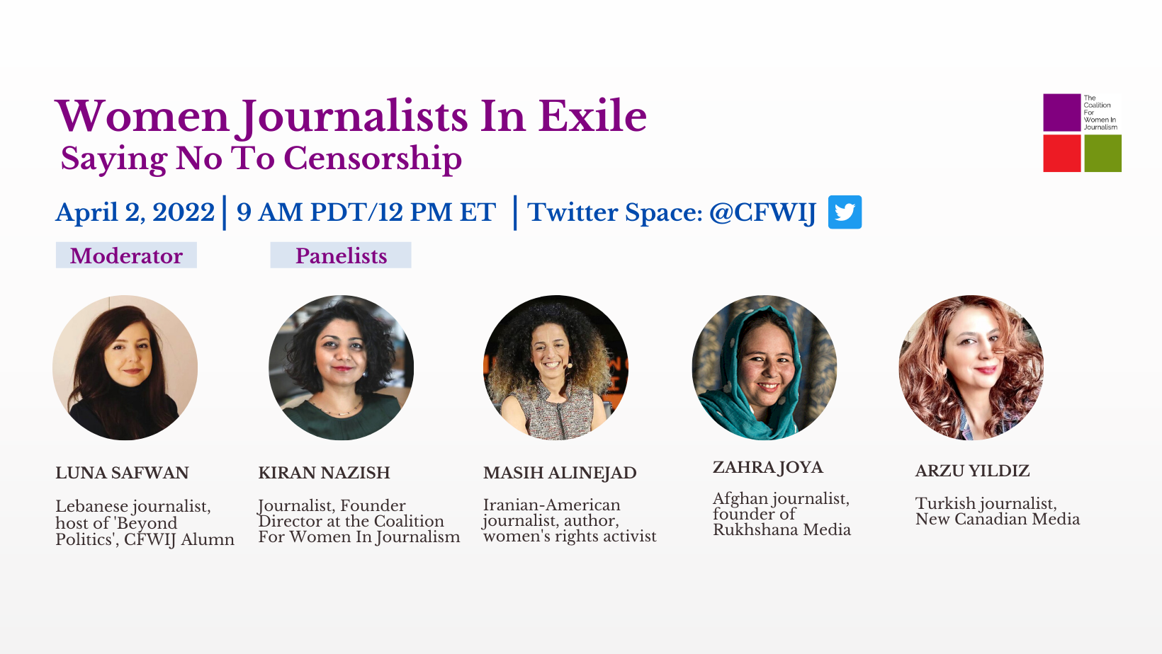 Exiled journalists often face indiscriminate challenges in host countries. The CFWIJ brings some of these brave journalists to our panel this month to discuss their journeys. Join us in this conversation with Luna Safwan, Kiran Nazish, Masih Alinejad and Arzu Yıldız