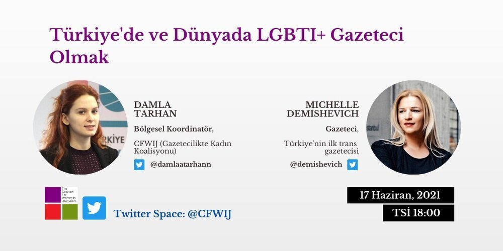 Türkiye'de ve dünyada LGBTI+ gazeteci olmanın getirdikleri, karşılaşılan zorluklar ve medyadaki karşıt söylemler üzerine #CFWIJ koordinatörü Damla Tarhan, Türkiye'nin ilk trans gazetecisi Michelle Demishevich ile konuşacak. Perşembe akşam 6'da Twitter Spaces'de buluşalım!