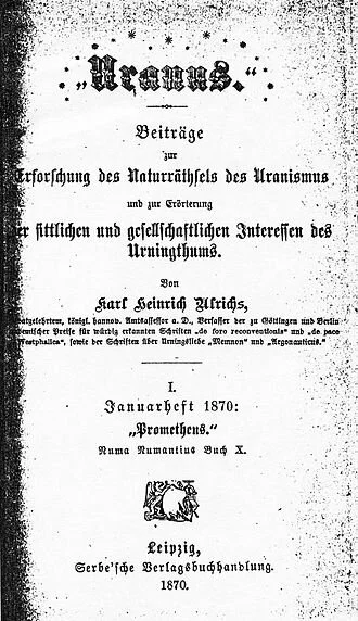 First page of the uranus magazine where ulrichs goes by the pseudonym prometheus. Prometheus is known in greek mythology for defying the gods by stealing fire and giving it to humanity.