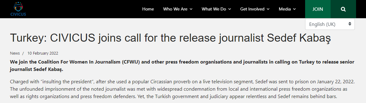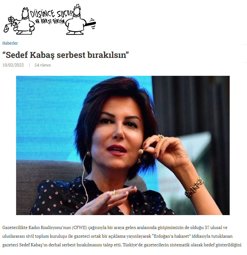 The Coalition For Women In Journalism (CFWIJ) and 38 press freedom organizations and journalists call on Turkey to release senior journalist Sedef Kabaş. Charged with “insulting the president”, after she used a popular Circassian proverb on a live television segment, Sedef was sent to prison on January 22, 2022.