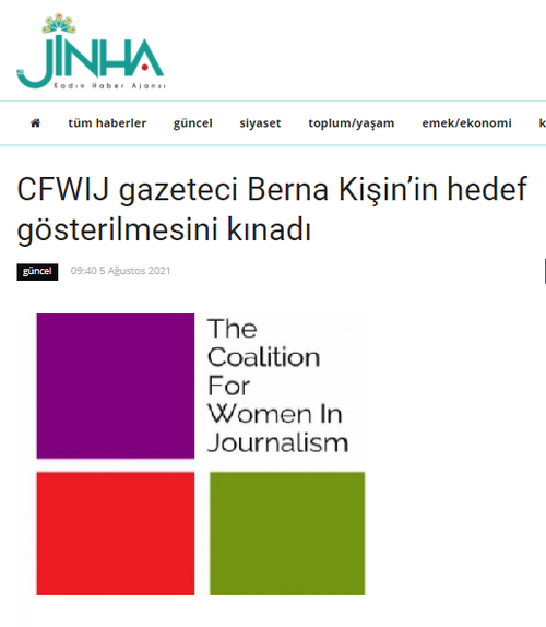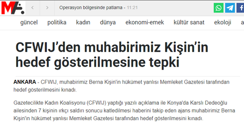 Journalist Berna Kişin was deliberately targeted by the pro-government Memleket Newspaper, following her coverage of the assassination of seven people in the same family in Konya. The news outlet alleged that the journalist wrote a pro-terrorist story. The Coalition For Women In Journalism (CFWIJ) condemns the news outlet targeting the journalist. As the coalition, we stand in solidarity with Berna. No journalist should be targeted as a result of the coverage they do.