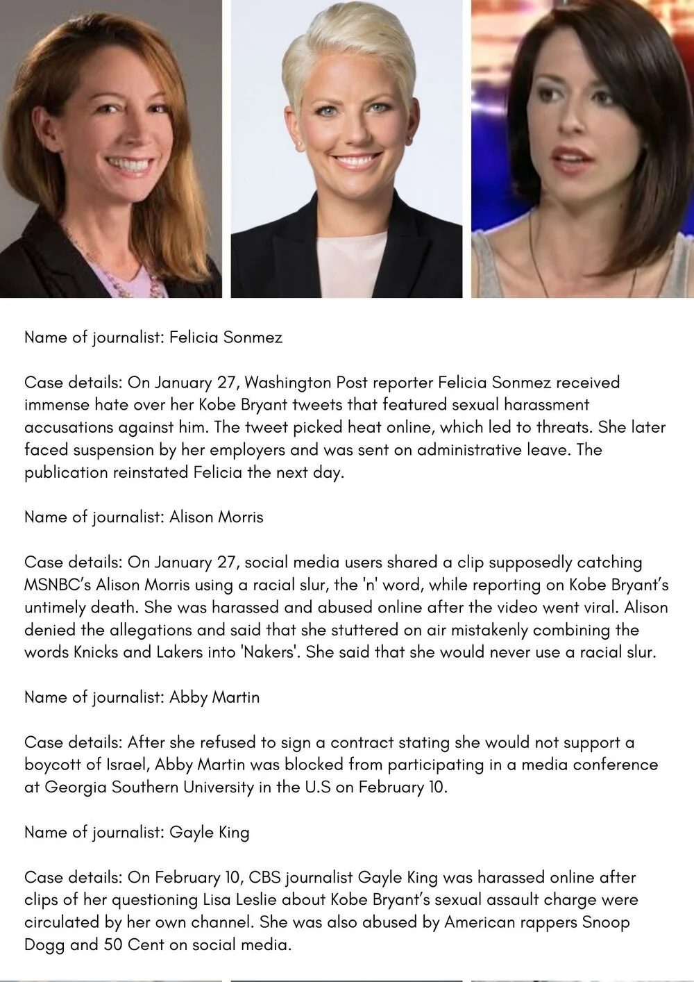 If you would like to request more insight into our findings, or would like to suggest an addition to our work reach out to us at data@womeninjournalism.org. For media inquiries reach out to us at press@womeninjournalism.org.
