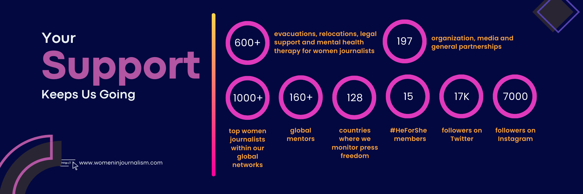 The Coalition For Women In Journalism is a global non-profit organization that supports and advocates for women and LGBTQ+ journalists around the world. Our Press Freedom Newsroom covers violations from 128 countries. These include professional and work related harassment, violence encountered during an assignment, imprisonments, detentions, SLAPP cases, police violence, assaults and murders. Alongside the global monitoring and reporting, we are also involved in exploring ways to support, safety and equity related issues. Since 2019, the CFWIJ has supported and advocated for more than 2,000 women journalists who encountered such circumstances. CFWIJ's work has led to more than 600 evacuations and relocations of persecuted women and LGBTQ+ journalists from Afghanistan, Ukraine, Iran, Mexico, Egypt, Iraq, Syria, Pakistan, and Turkey.