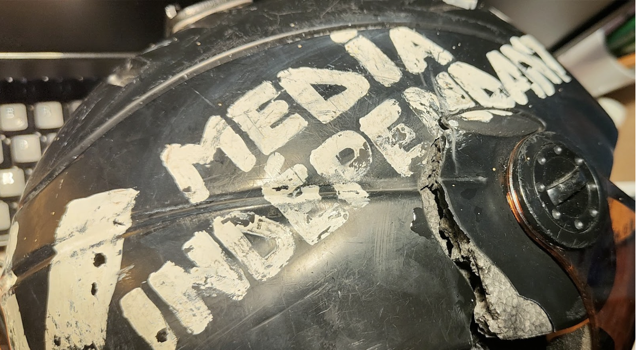 Emma Audrey’s helmet cracked during the assault. CREDIT: Emma Audrey