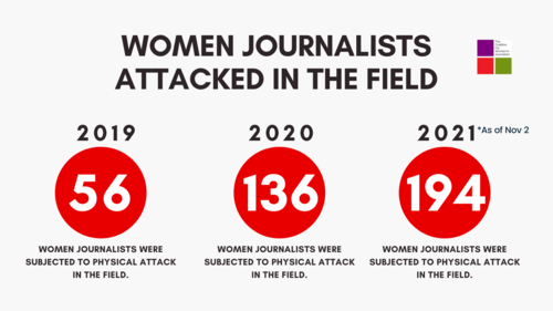 The CFWIJ also recorded cases of physical assault and police brutality against women journalists in the field. Across the globe, 76 women journalists were physically assaulted and attacked in the field in 2021.