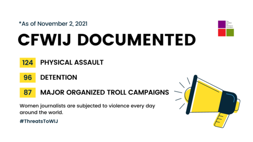In 2021, the CFWIJ documented at least 741 violations against women journalists across the globe. Of these, 26 cases were of workplace harassment, 22 were of sexual harassment, 13 women journalists were subjected to verbal harassment and at least three women journalists were discriminated against solely because of their gender. We also recorded 157 cases of legal harassment of women journalists, 124 cases of physical assault, 71 instances of women journalists obstructed in the field, 87 organized troll campaigns, 49 threats of violence or intimidation, 40 cases of women journalists expelled from work, nine killings of women journalists, eight instances of state operation, six arrests and three cases of revoked press accreditation. Moreover, three journalists were abducted and eight were exposed to racial discrimination.