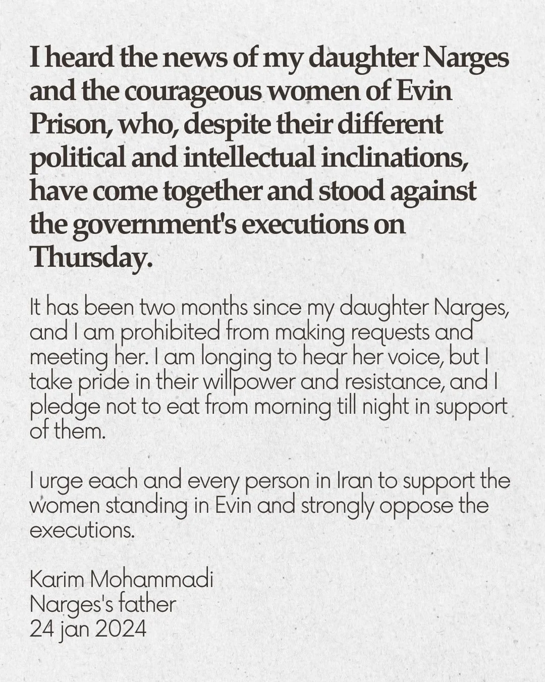 Narges’s father urged “each and every person in Iran” to support his daughter and other women journalists and activists standing against human rights violations in Evin, calling them to “strongly oppose the executions.”