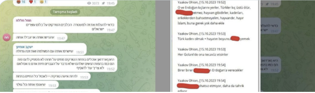 Screenshots of threats directed at Fulya Öztürk in an Israeli Telegram group.