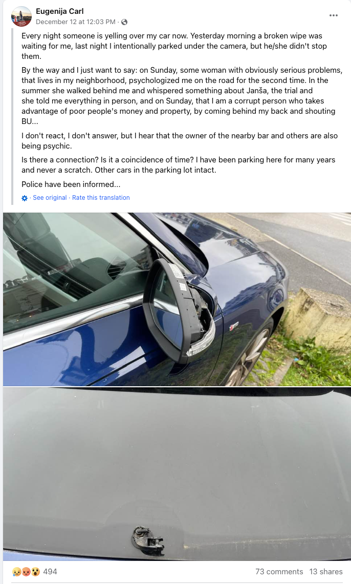 "Someone is now attacking my car every night. Yesterday morning, a broken wiper awaited me, and last night I intentionally parked under the camera, but it still didn't stop him/her/them," wrote Eugenija Carl on Facebook on December 12, 2023.