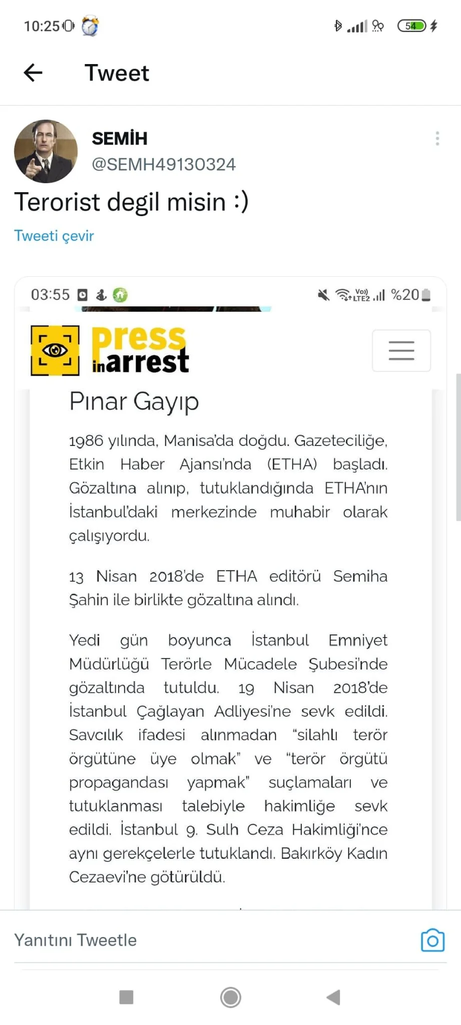 Gazeteci Pınar Gayıp, 2020 yılında gönüllü staj yaptığı avukatlık bürosunda cinsel saldırıya uğrayan Arzu Sena Topuz hakkında yazdığı haberlerin ardından taciz eden failin avukatı tarafından tehdit edildi. Sosyal medya hesabından gazeteciyi belirli aralıklarla “terörist” ifadeleriyle hedef gösteren avukat, en son yaptığı paylaşımda ise gazeteciyi “parmaklarını kırmakla” tehdit etti. Twitter hesabından Pınar Gayıp’ı hedef gösteren avukat sonrasında hesabını askıya aldı.