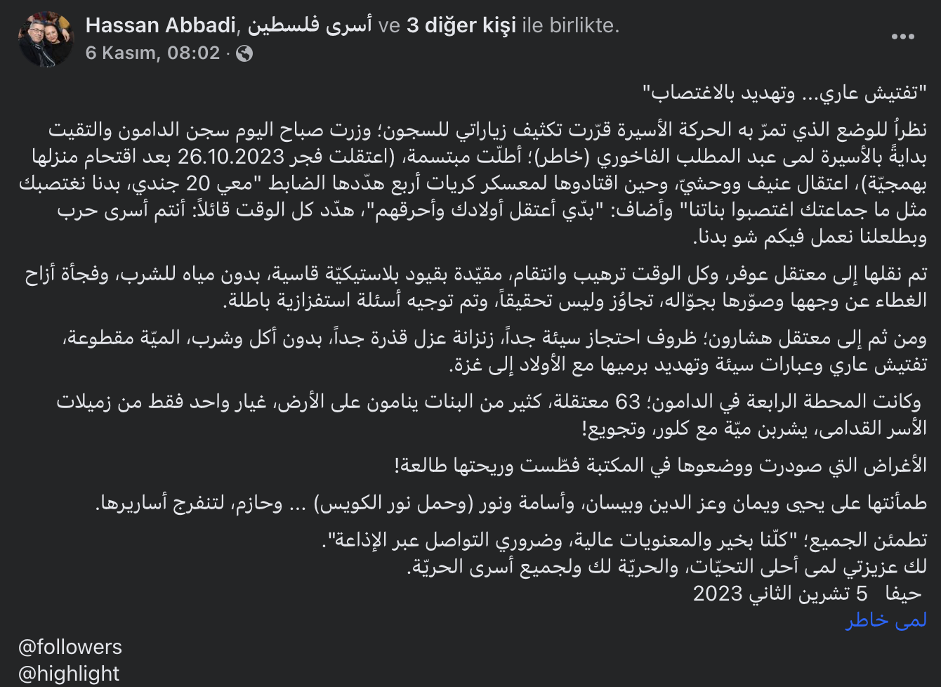 On November 9, 2023, Fakhoury, informed the Committee to Protect Journalists (CPJ) about soldiers threatening Khater with sexual violence and harm to her children. Her lawyer, Hassan Abbadi, confirmed these allegations after visiting Khater in prison and shared the details on Facebook. Abbadi also revealed to CPJ that Khater was strip-searched and threatened with deportation to Gaza, intensifying concerns about her treatment and raising significant human rights issues. The reasons for her detention are unknown.